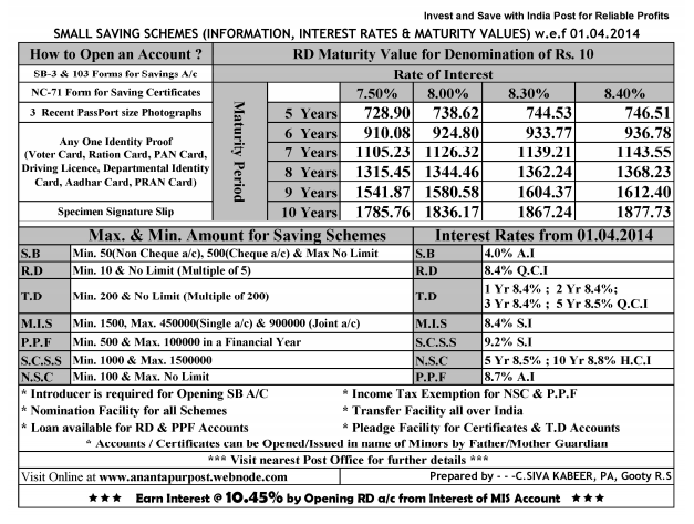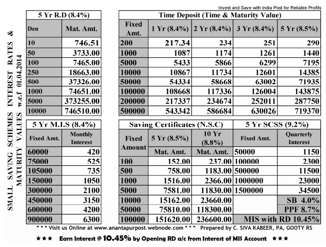 Saving Schemes Interest Rates & Maturity Values w.e.f 01.04.2014